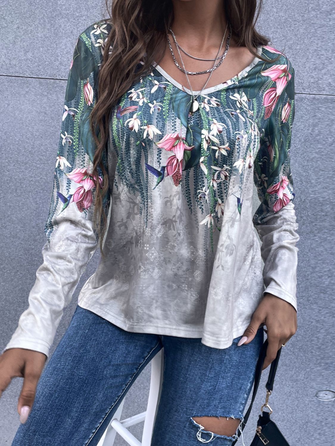Floral V-Neck Long Sleeve Tee