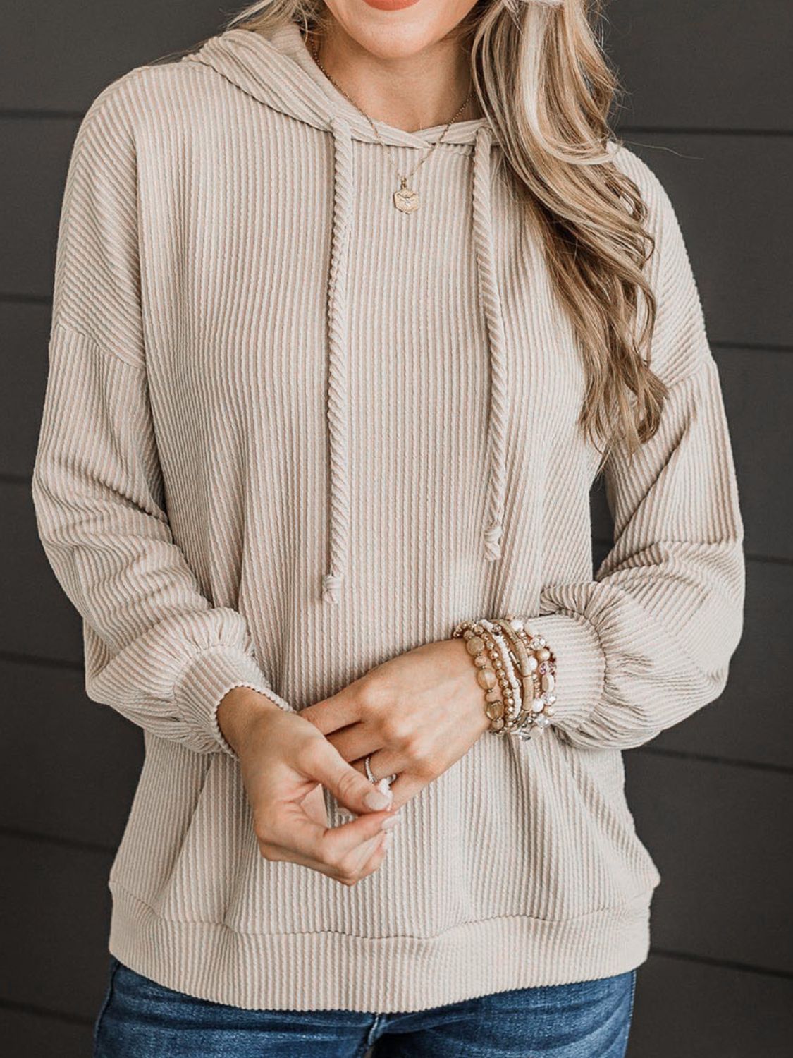 Detailed description of the Ribbed Drawstring Dropped Shoulder Hoodie, highlighting quality, design, and unique features that make it appealing to end consumers.