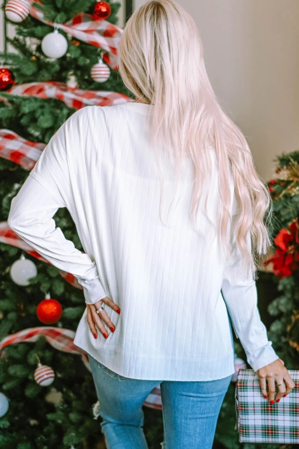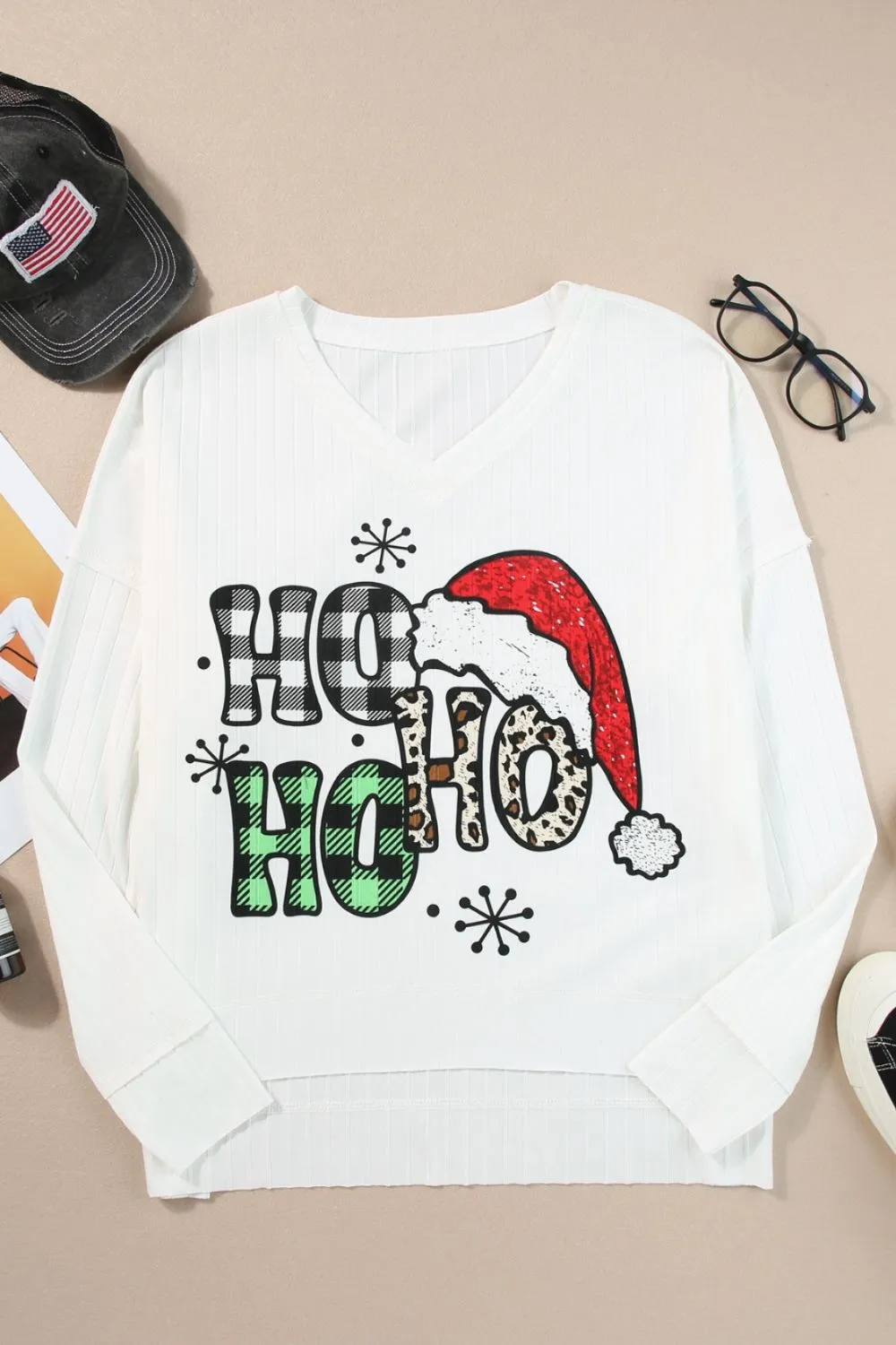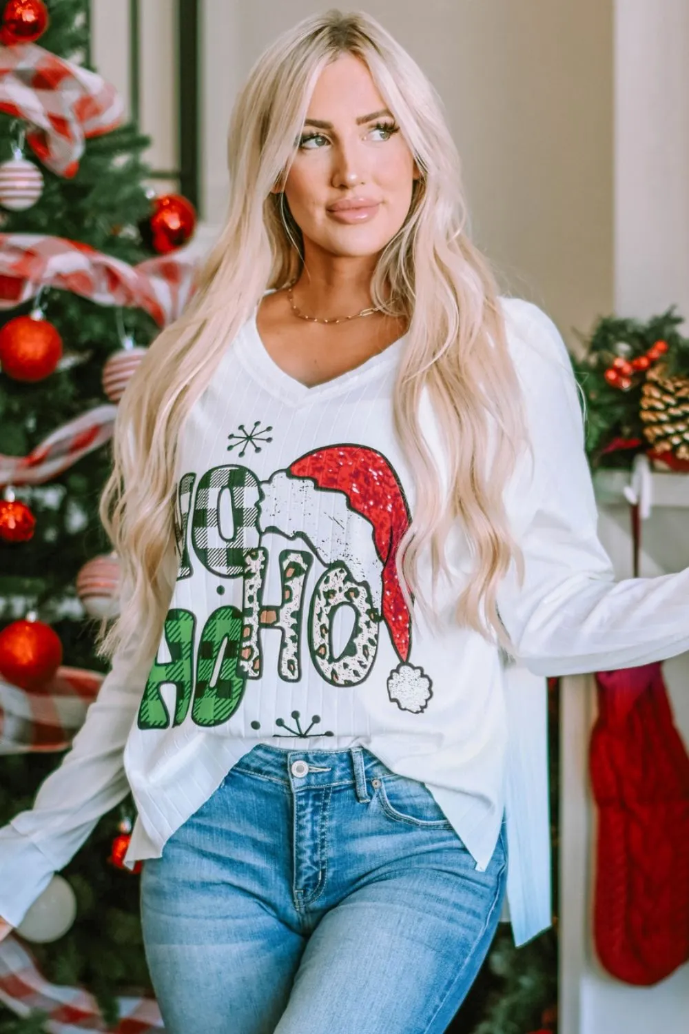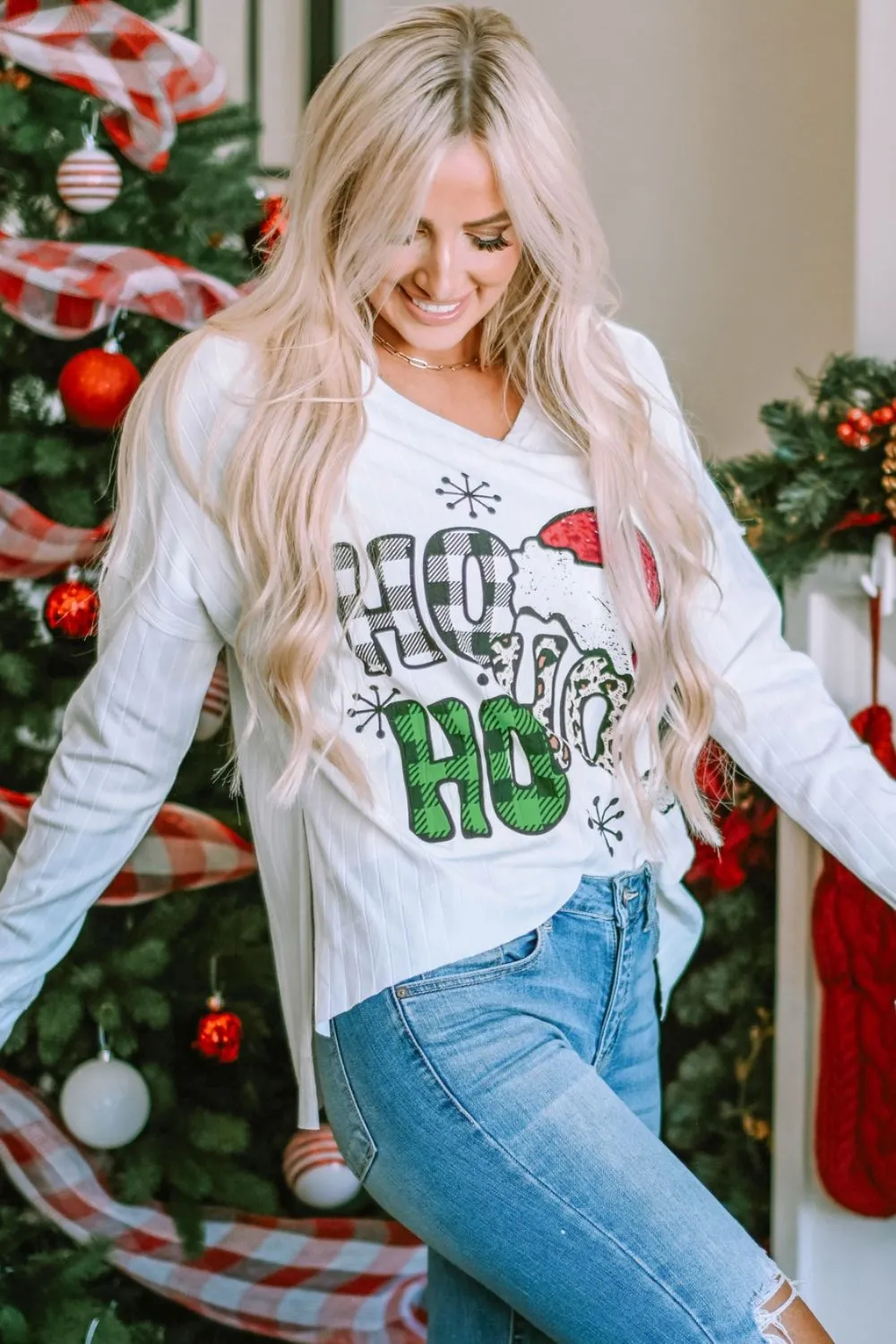 V-Neck Christmas Graphic High-Low Design Long Sleeve Top