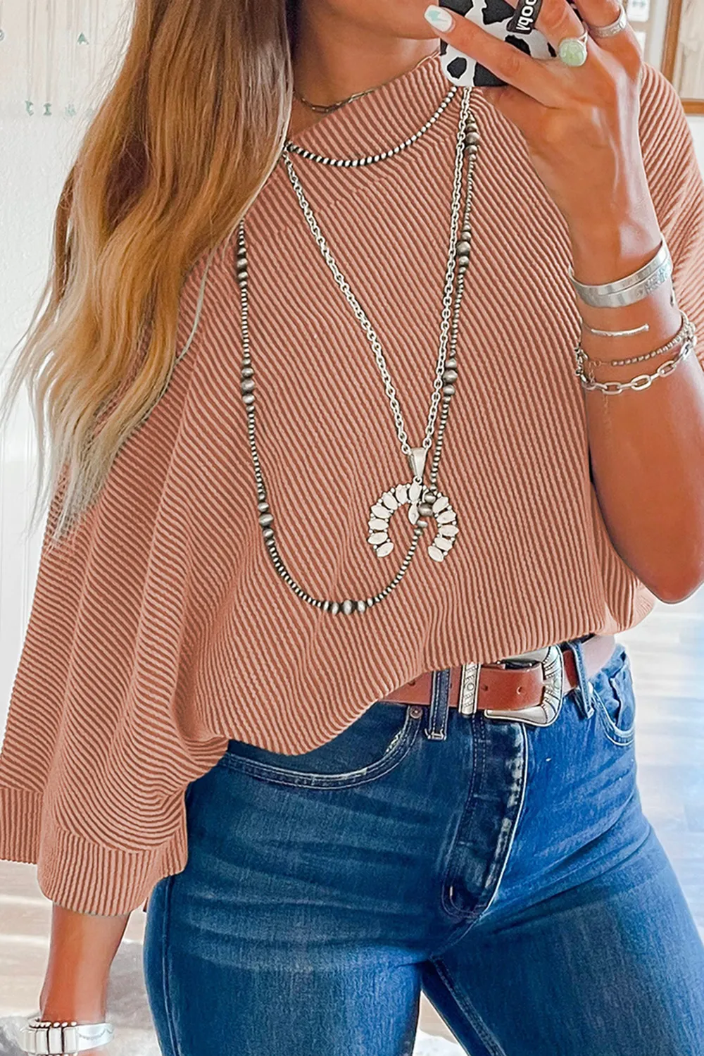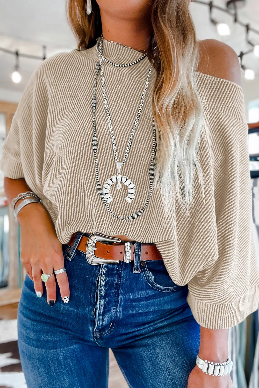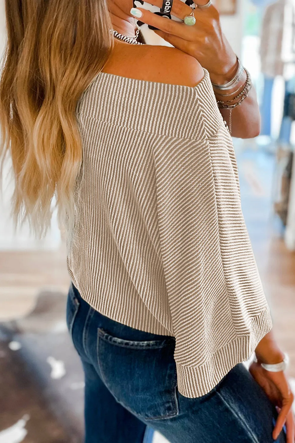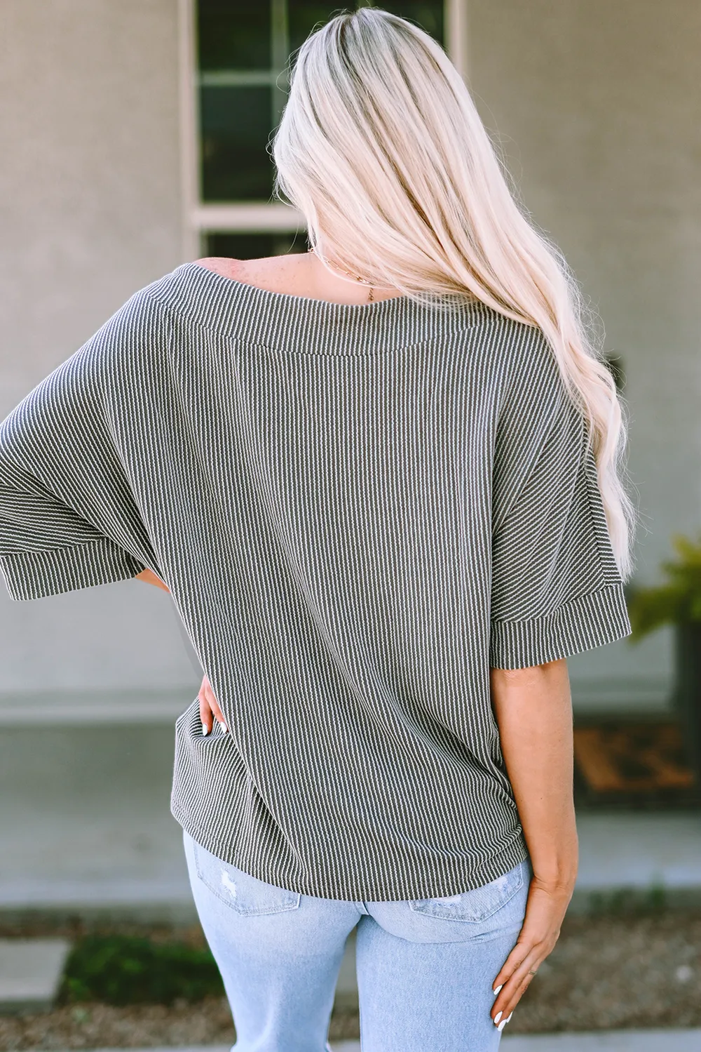 Ribbed Boat Neck Batwing Sleeve T-Shirt