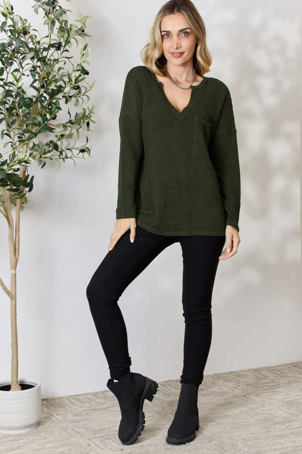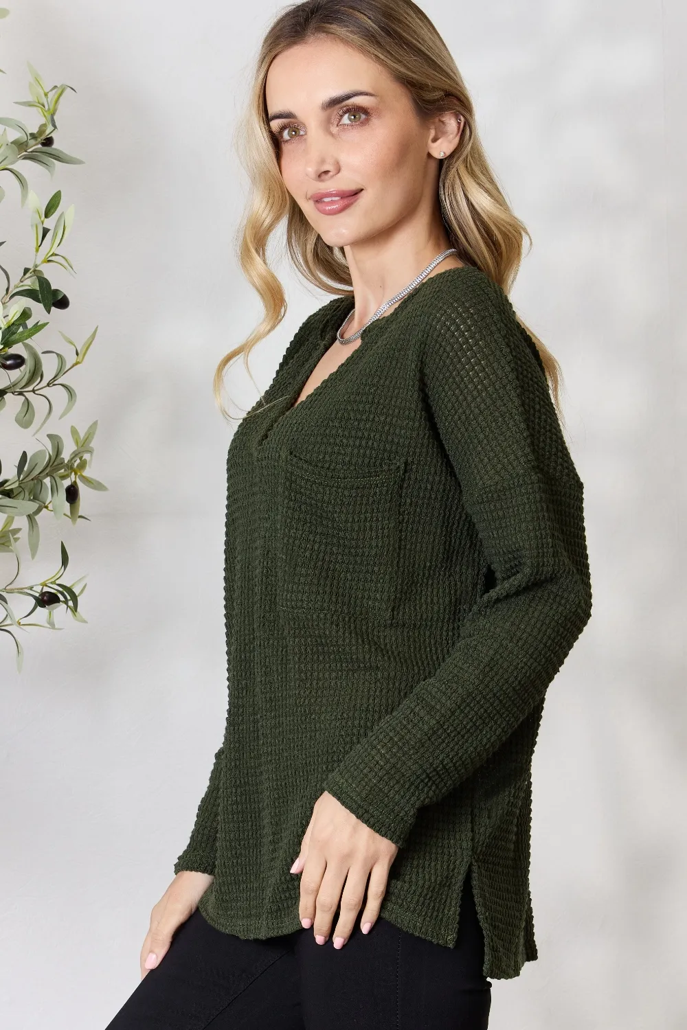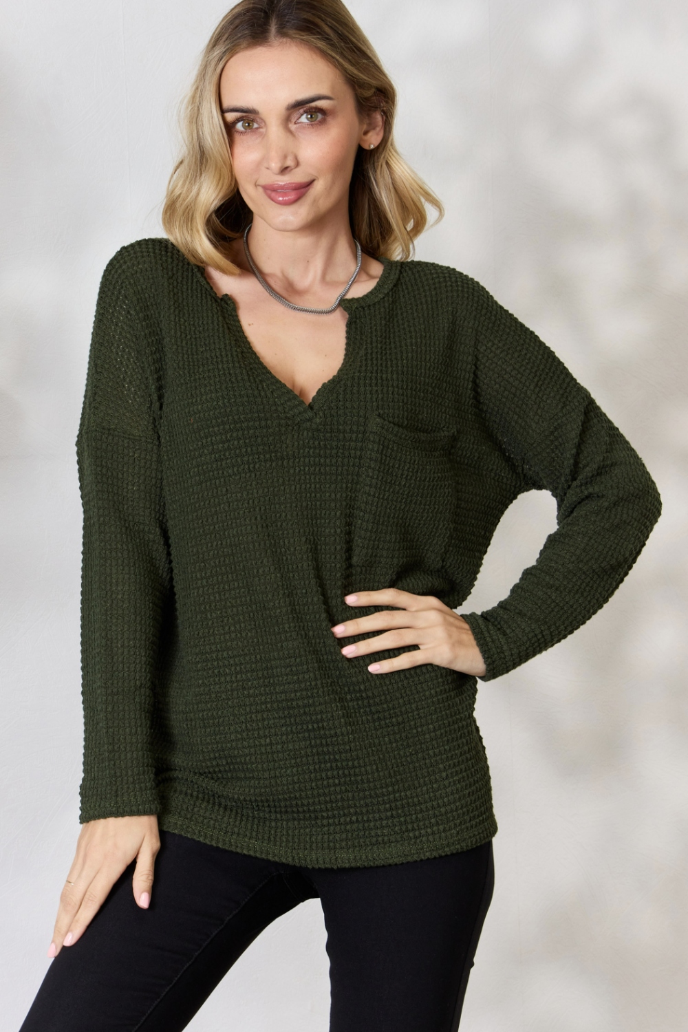 BiBi Notched Popcorn Waffle Long Sleeve Top