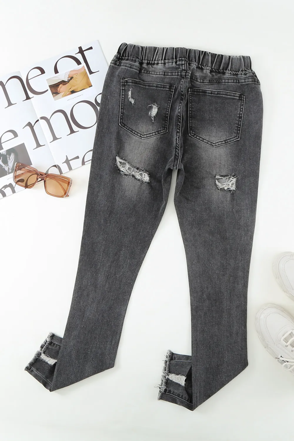 Drawstring Distressed Raw Hem Jeans with Pockets