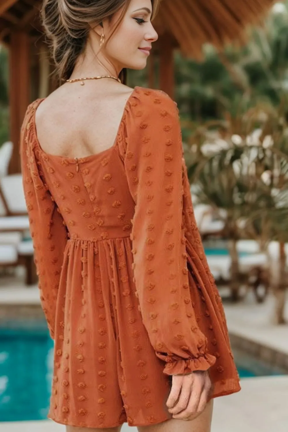 Detailed description of the Swiss Dot Square Neck Flounce Sleeve Romper, highlighting quality, design, and unique features that make it appealing to end consumers.
