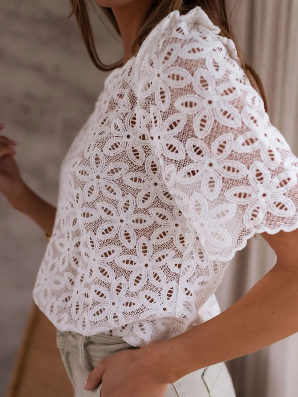 Detailed description of the Openwork Round Neck Short Sleeve Blouse, highlighting quality, design, and unique features that make it appealing to end consumers.